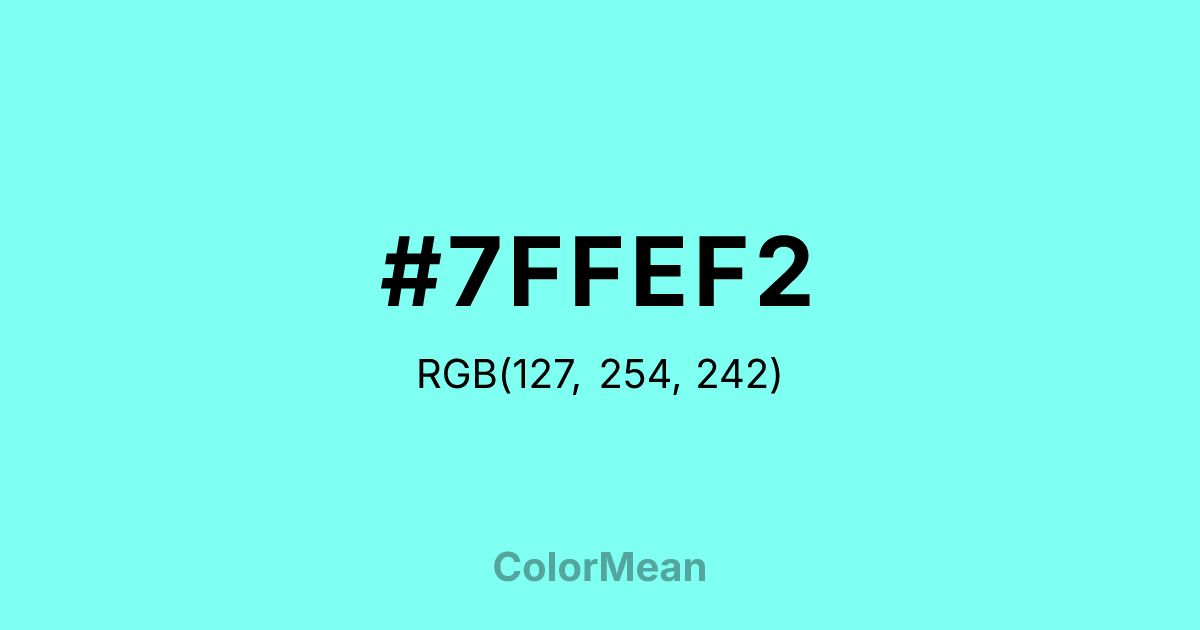 #7FFEF2 RGB value is (127, 254, 242). The hex color red value is 127, green is 254, and blue is 242. Its HSL format shows a hue of 174°, saturation of 98 percent, and lightness of 75 percent. The CMYK process values are 50 percent, 0 percent, 5 percent, 0 percent.