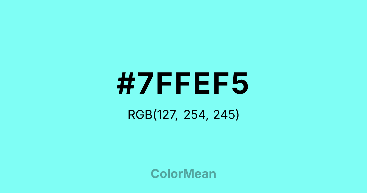 #7FFEF5 RGB value is (127, 254, 245). The hex color red value is 127, green is 254, and blue is 245. Its HSL format shows a hue of 176°, saturation of 98 percent, and lightness of 75 percent. The CMYK process values are 50 percent, 0 percent, 4 percent, 0 percent.