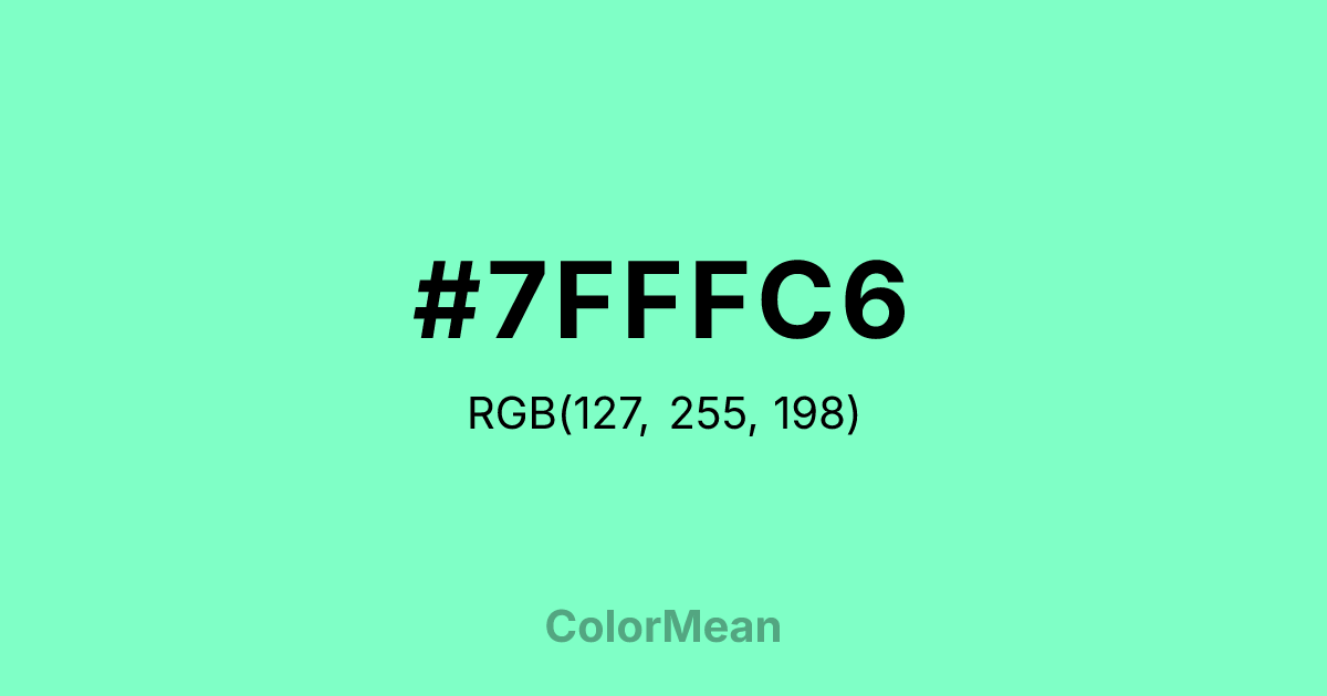 #7FFFC6 RGB value is (127, 255, 198). The hex color red value is 127, green is 255, and blue is 198. Its HSL format shows a hue of 153°, saturation of 100 percent, and lightness of 75 percent. The CMYK process values are 50 percent, 0 percent, 22 percent, 0 percent.