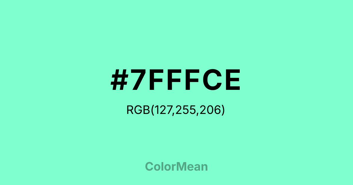 #7FFFCE RGB value is (127, 255, 206). The hex color red value is 127, green is 255, and blue is 206. Its HSL format shows a hue of 157°, saturation of 100 percent, and lightness of 75 percent. The CMYK process values are 50 percent, 0 percent, 19 percent, 0 percent.