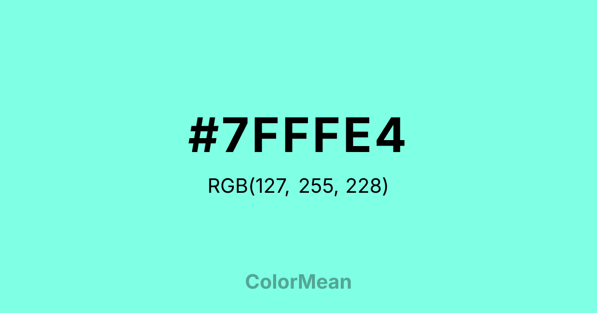 #7FFFE4 RGB value is (127, 255, 228). The hex color red value is 127, green is 255, and blue is 228. Its HSL format shows a hue of 167°, saturation of 100 percent, and lightness of 75 percent. The CMYK process values are 50 percent, 0 percent, 11 percent, 0 percent.
