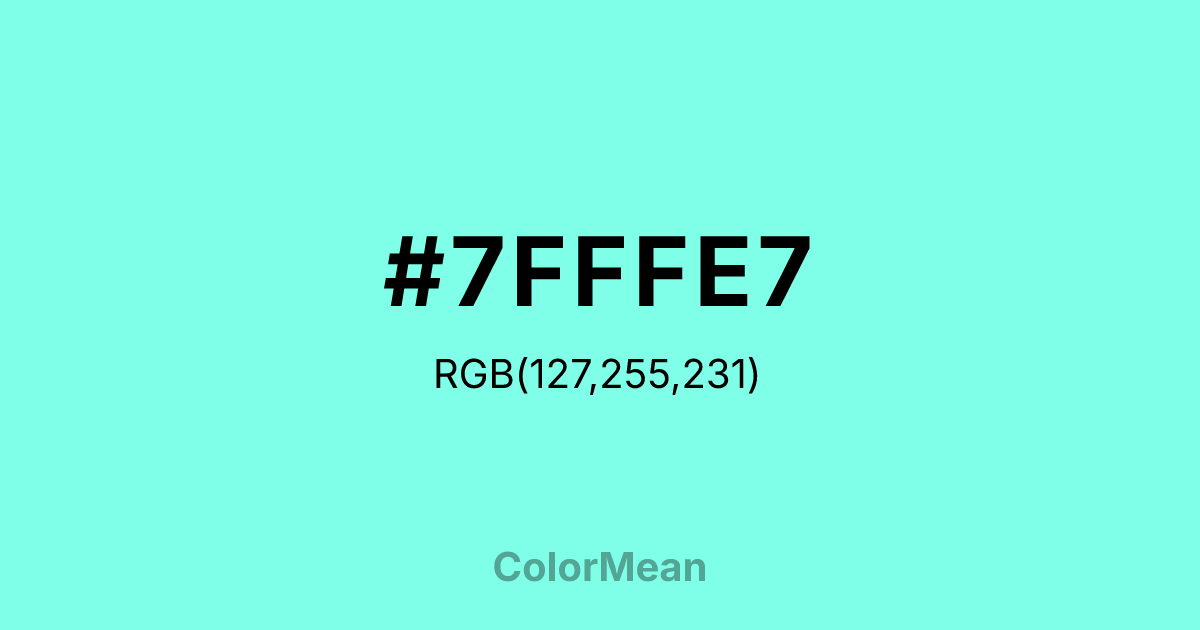 #7FFFE7 RGB value is (127, 255, 231). The hex color red value is 127, green is 255, and blue is 231. Its HSL format shows a hue of 169°, saturation of 100 percent, and lightness of 75 percent. The CMYK process values are 50 percent, 0 percent, 9 percent, 0 percent.