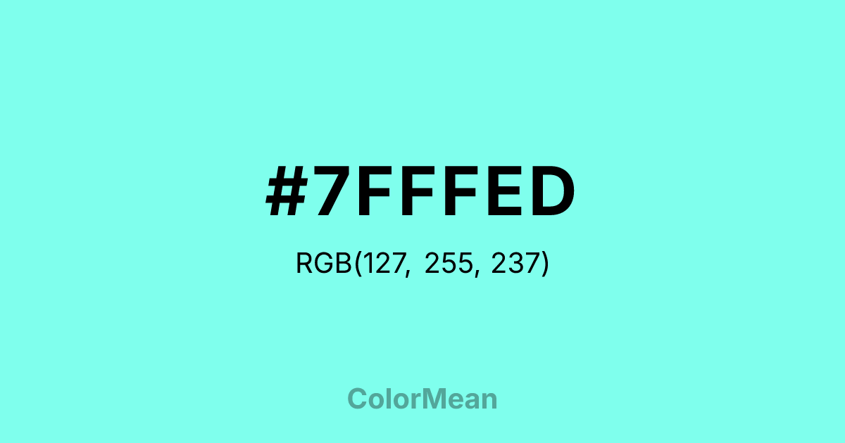 #7FFFED RGB value is (127, 255, 237). The hex color red value is 127, green is 255, and blue is 237. Its HSL format shows a hue of 172°, saturation of 100 percent, and lightness of 75 percent. The CMYK process values are 50 percent, 0 percent, 7 percent, 0 percent.