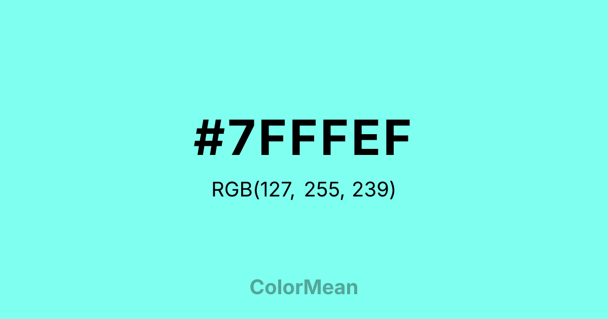 #7FFFEF RGB value is (127, 255, 239). The hex color red value is 127, green is 255, and blue is 239. Its HSL format shows a hue of 173°, saturation of 100 percent, and lightness of 75 percent. The CMYK process values are 50 percent, 0 percent, 6 percent, 0 percent.