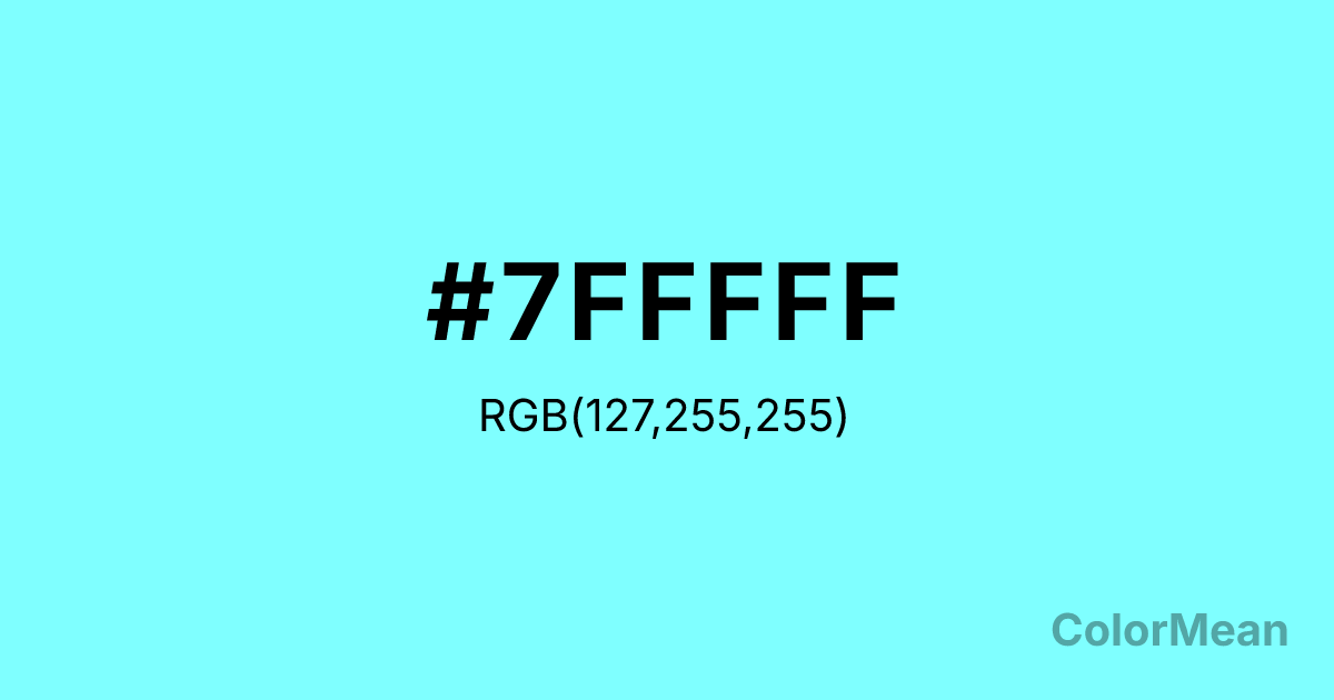 #7FFFFF RGB value is (127, 255, 255). The hex color red value is 127, green is 255, and blue is 255. Its HSL format shows a hue of 180°, saturation of 100 percent, and lightness of 75 percent. The CMYK process values are 50 percent, 0 percent, 0 percent, 0 percent.