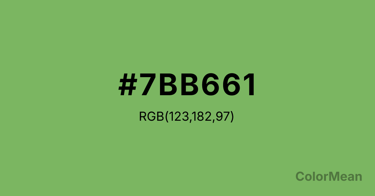 Bud Green (#7BB661) RGB value is (123, 182, 97). The hex color red value is 123, green is 182, and blue is 97. Its HSL format shows a hue of 102°, saturation of 37 percent, and lightness of 55 percent. The CMYK process values are 32 percent, 0 percent, 47 percent, 29 percent.