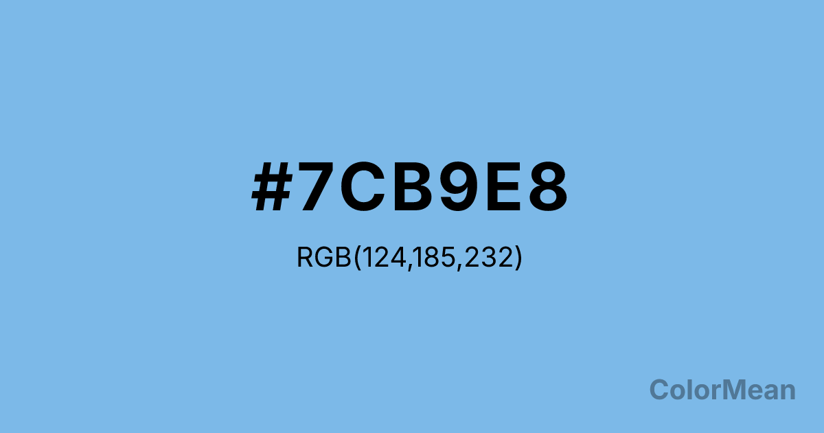 Aero (#7CB9E8) RGB value is (124, 185, 232). The hex color red value is 124, green is 185, and blue is 232. Its HSL format shows a hue of 206°, saturation of 70 percent, and lightness of 70 percent. The CMYK process values are 47 percent, 20 percent, 0 percent, 9 percent.