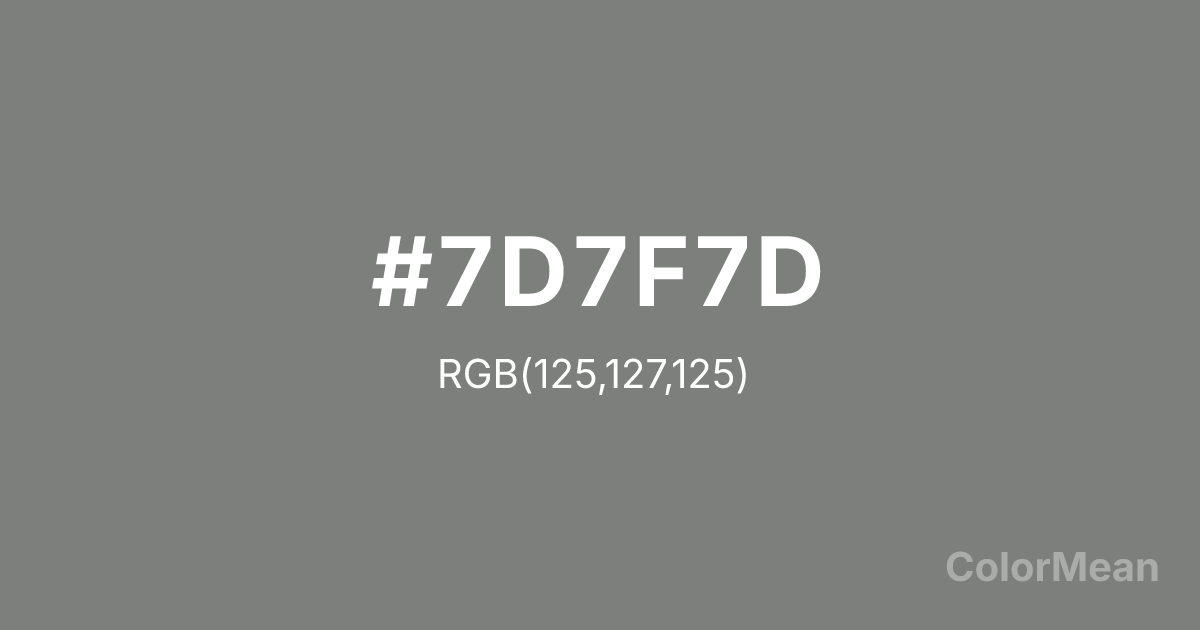 Dusty Grey (#7D7F7D) RGB value is (125, 127, 125). The hex color red value is 125, green is 127, and blue is 125. Its HSL format shows a hue of 120°, saturation of 1 percent, and lightness of 49 percent. The CMYK process values are 2 percent, 0 percent, 2 percent, 50 percent.