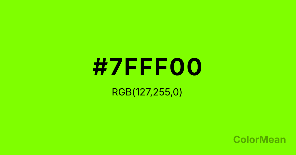 Chartreuse (web) (#7FFF00) RGB value is (127, 255, 0). The hex color red value is 127, green is 255, and blue is 0. Its HSL format shows a hue of 90°, saturation of 100 percent, and lightness of 50 percent. The CMYK process values are 50 percent, 0 percent, 100 percent, 0 percent.