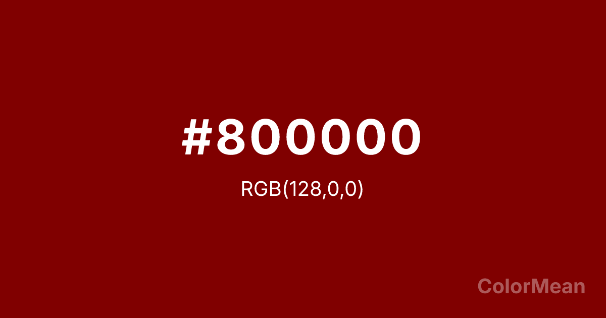 Maroon (HTML/CSS) (#800000) RGB value is (128, 0, 0). The hex color red value is 128, green is 0, and blue is 0. Its HSL format shows a hue of 0°, saturation of 100 percent, and lightness of 25 percent. The CMYK process values are 0 percent, 100 percent, 100 percent, 50 percent.