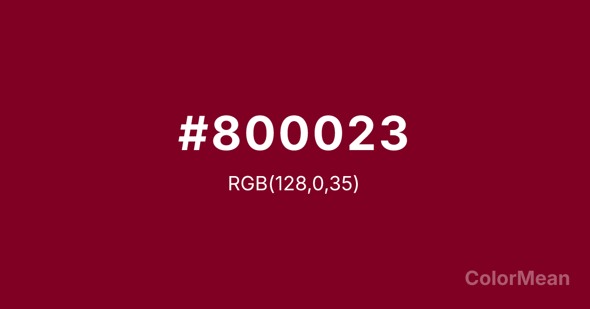 #800023 RGB value is (128, 0, 35). The hex color red value is 128, green is 0, and blue is 35. Its HSL format shows a hue of 344°, saturation of 100 percent, and lightness of 25 percent. The CMYK process values are 0 percent, 100 percent, 73 percent, 50 percent.