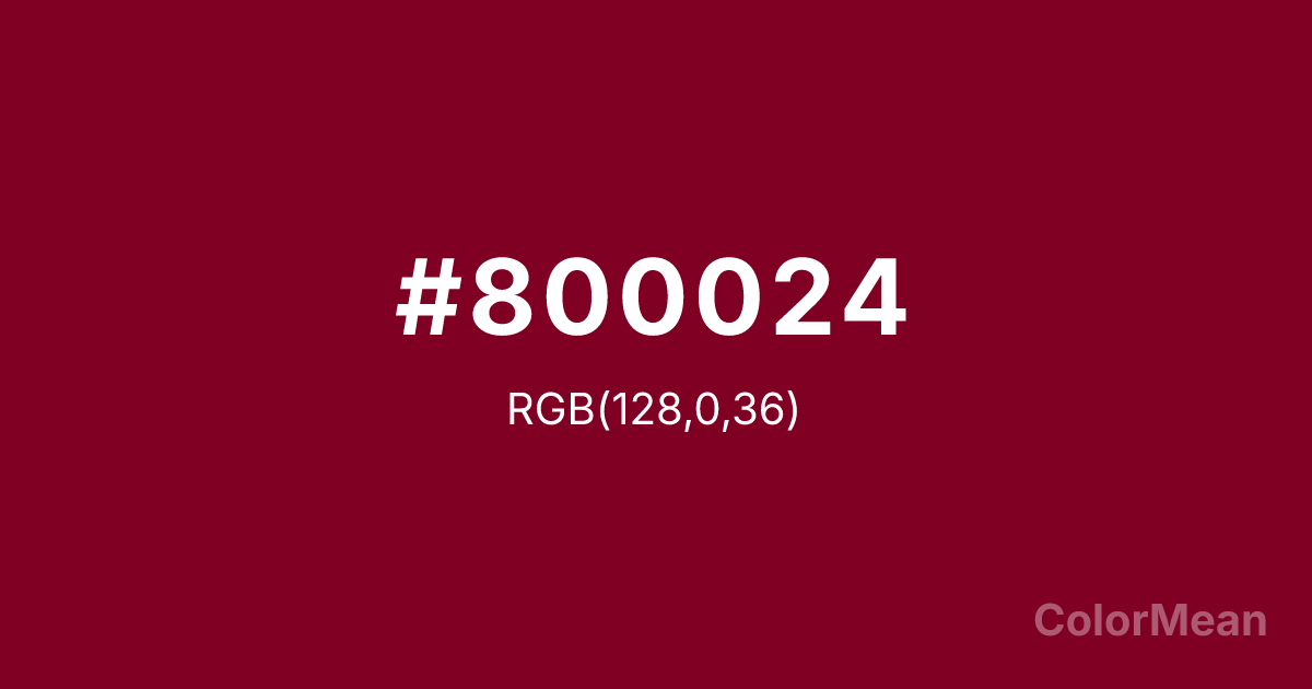 #800024 RGB value is (128, 0, 36). The hex color red value is 128, green is 0, and blue is 36. Its HSL format shows a hue of 343°, saturation of 100 percent, and lightness of 25 percent. The CMYK process values are 0 percent, 100 percent, 72 percent, 50 percent.