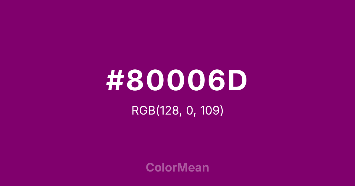 #80006D RGB value is (128, 0, 109). The hex color red value is 128, green is 0, and blue is 109. Its HSL format shows a hue of 309°, saturation of 100 percent, and lightness of 25 percent. The CMYK process values are 0 percent, 100 percent, 15 percent, 50 percent.