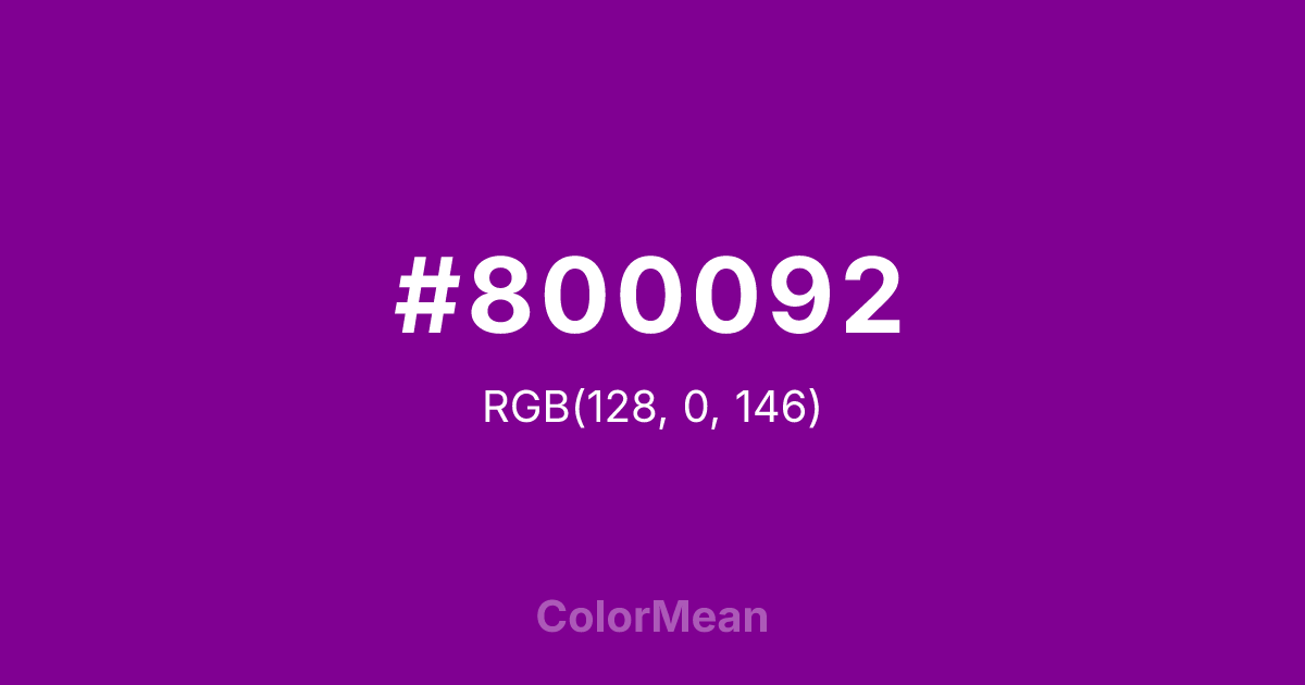 #800092 RGB value is (128, 0, 146). The hex color red value is 128, green is 0, and blue is 146. Its HSL format shows a hue of 293°, saturation of 100 percent, and lightness of 29 percent. The CMYK process values are 12 percent, 100 percent, 0 percent, 43 percent.