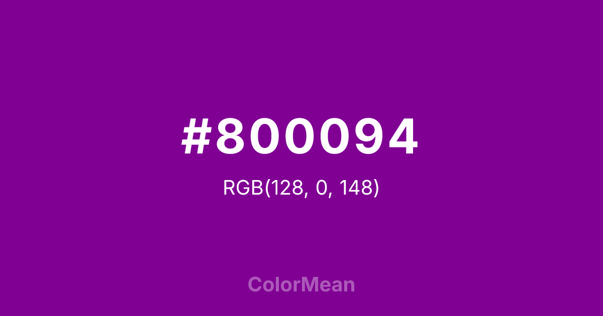#800094 RGB value is (128, 0, 148). The hex color red value is 128, green is 0, and blue is 148. Its HSL format shows a hue of 292°, saturation of 100 percent, and lightness of 29 percent. The CMYK process values are 14 percent, 100 percent, 0 percent, 42 percent.