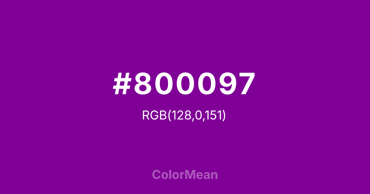 #800097 RGB value is (128, 0, 151). The hex color red value is 128, green is 0, and blue is 151. Its HSL format shows a hue of 291°, saturation of 100 percent, and lightness of 30 percent. The CMYK process values are 15 percent, 100 percent, 0 percent, 41 percent.