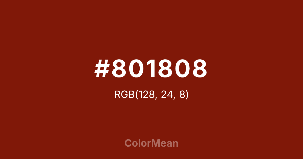 #801808 RGB value is (128, 24, 8). The hex color red value is 128, green is 24, and blue is 8. Its HSL format shows a hue of 8°, saturation of 88 percent, and lightness of 27 percent. The CMYK process values are 0 percent, 81 percent, 94 percent, 50 percent.