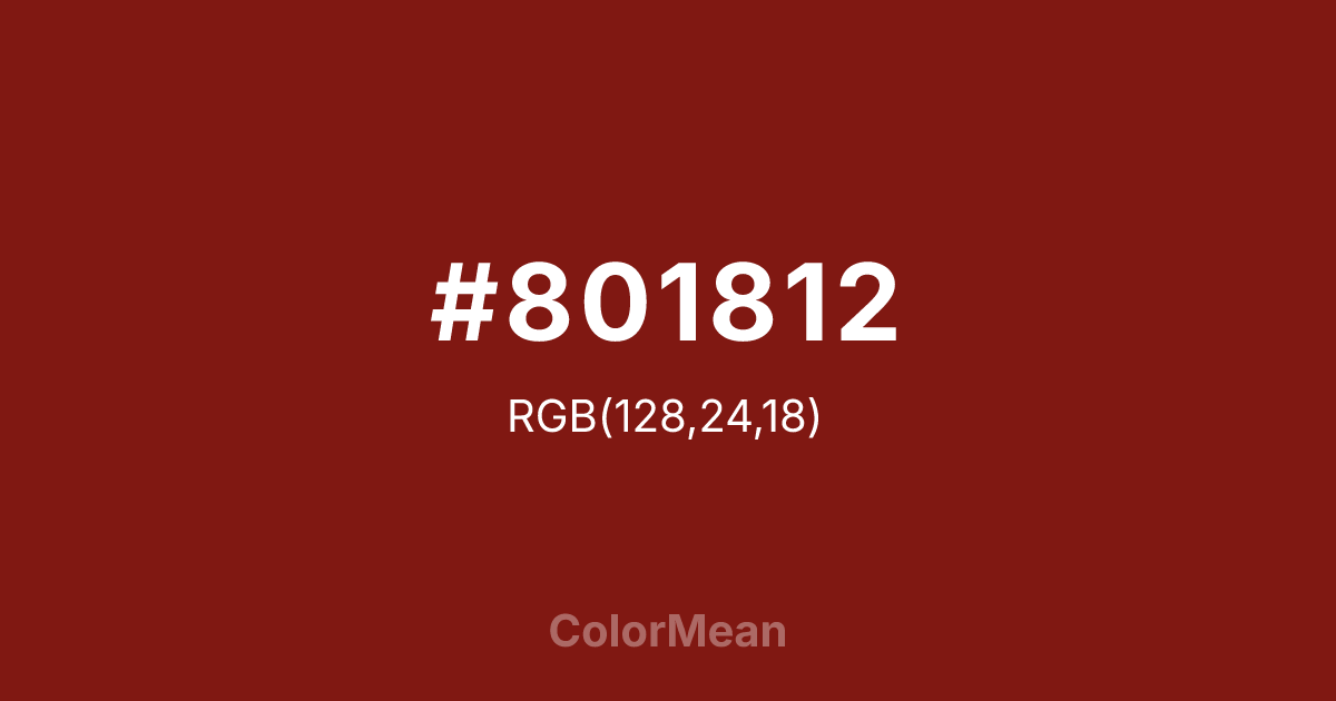 #801812 RGB value is (128, 24, 18). The hex color red value is 128, green is 24, and blue is 18. Its HSL format shows a hue of 3°, saturation of 75 percent, and lightness of 29 percent. The CMYK process values are 0 percent, 81 percent, 86 percent, 50 percent.