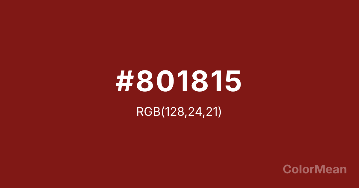#801815 RGB value is (128, 24, 21). The hex color red value is 128, green is 24, and blue is 21. Its HSL format shows a hue of 2°, saturation of 72 percent, and lightness of 29 percent. The CMYK process values are 0 percent, 81 percent, 84 percent, 50 percent.