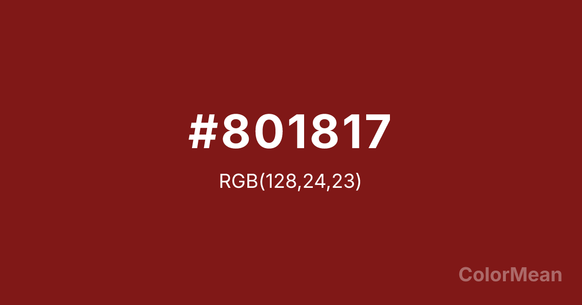 #801817 RGB value is (128, 24, 23). The hex color red value is 128, green is 24, and blue is 23. Its HSL format shows a hue of 1°, saturation of 70 percent, and lightness of 30 percent. The CMYK process values are 0 percent, 81 percent, 82 percent, 50 percent.