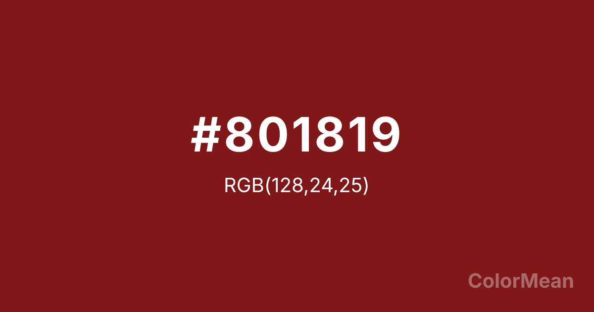 #801819 RGB value is (128, 24, 25). The hex color red value is 128, green is 24, and blue is 25. Its HSL format shows a hue of 359°, saturation of 68 percent, and lightness of 30 percent. The CMYK process values are 0 percent, 81 percent, 80 percent, 50 percent.