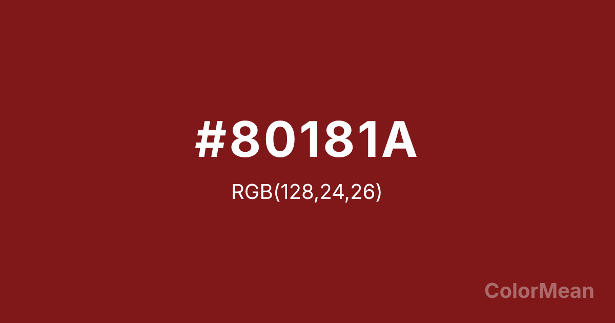 #80181A RGB value is (128, 24, 26). The hex color red value is 128, green is 24, and blue is 26. Its HSL format shows a hue of 359°, saturation of 68 percent, and lightness of 30 percent. The CMYK process values are 0 percent, 81 percent, 80 percent, 50 percent.