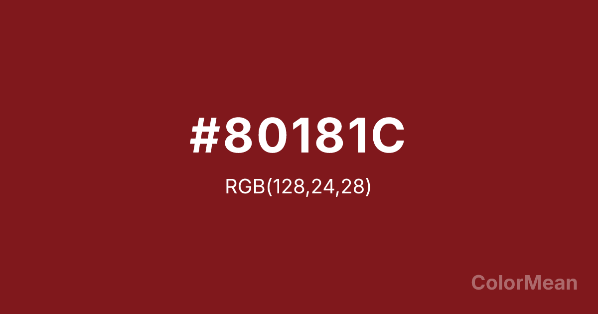 #80181C RGB value is (128, 24, 28). The hex color red value is 128, green is 24, and blue is 28. Its HSL format shows a hue of 358°, saturation of 68 percent, and lightness of 30 percent. The CMYK process values are 0 percent, 81 percent, 78 percent, 50 percent.
