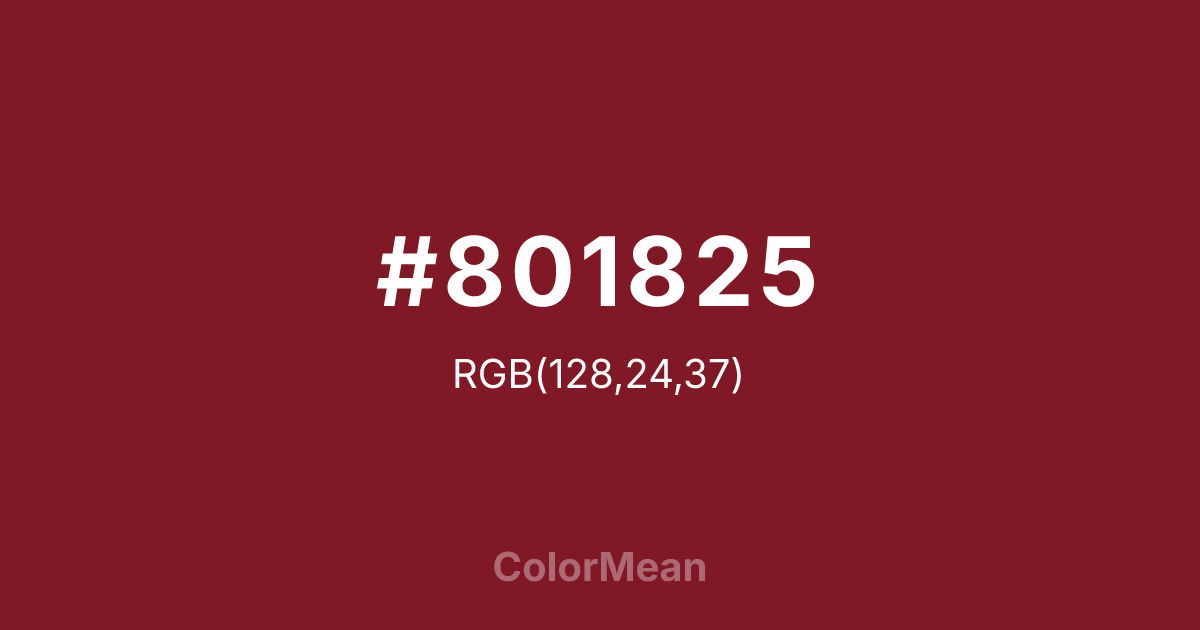 #801825 RGB value is (128, 24, 37). The hex color red value is 128, green is 24, and blue is 37. Its HSL format shows a hue of 353°, saturation of 68 percent, and lightness of 30 percent. The CMYK process values are 0 percent, 81 percent, 71 percent, 50 percent.