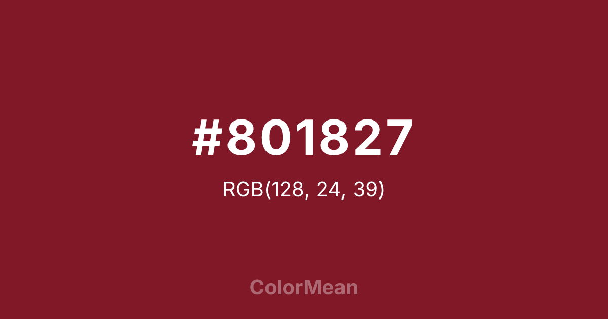 #801827 RGB value is (128, 24, 39). The hex color red value is 128, green is 24, and blue is 39. Its HSL format shows a hue of 351°, saturation of 68 percent, and lightness of 30 percent. The CMYK process values are 0 percent, 81 percent, 70 percent, 50 percent.