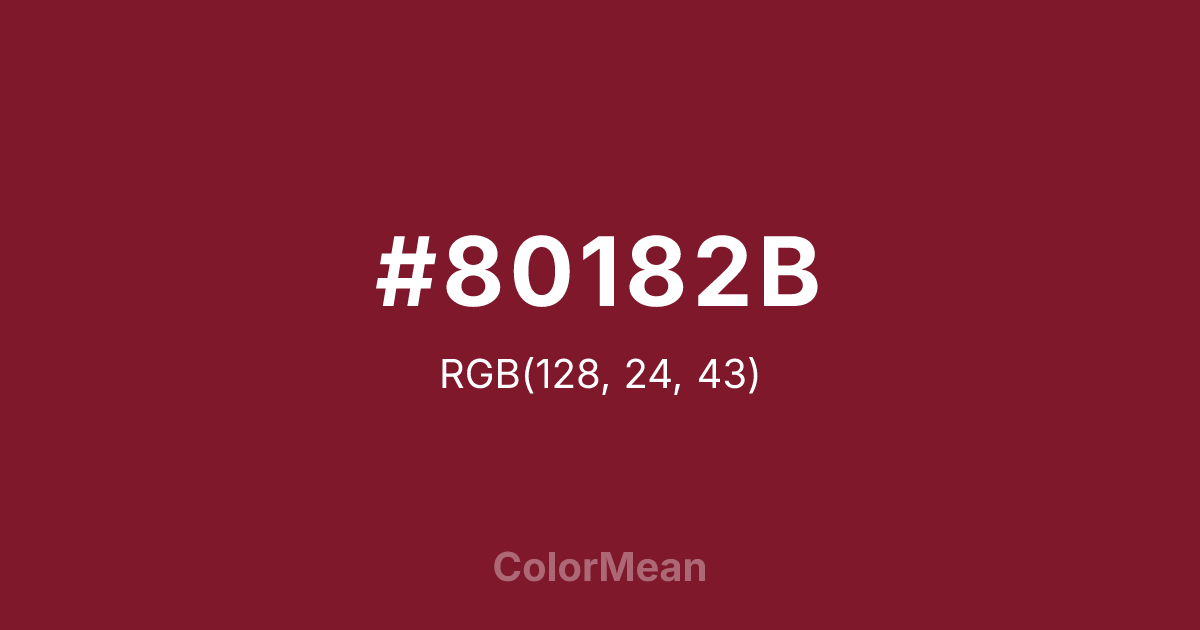 #80182B RGB value is (128, 24, 43). The hex color red value is 128, green is 24, and blue is 43. Its HSL format shows a hue of 349°, saturation of 68 percent, and lightness of 30 percent. The CMYK process values are 0 percent, 81 percent, 66 percent, 50 percent.