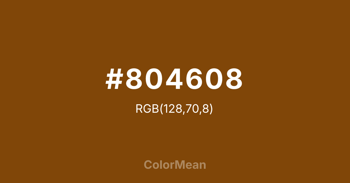 #804608 RGB value is (128, 70, 8). The hex color red value is 128, green is 70, and blue is 8. Its HSL format shows a hue of 31°, saturation of 88 percent, and lightness of 27 percent. The CMYK process values are 0 percent, 45 percent, 94 percent, 50 percent.