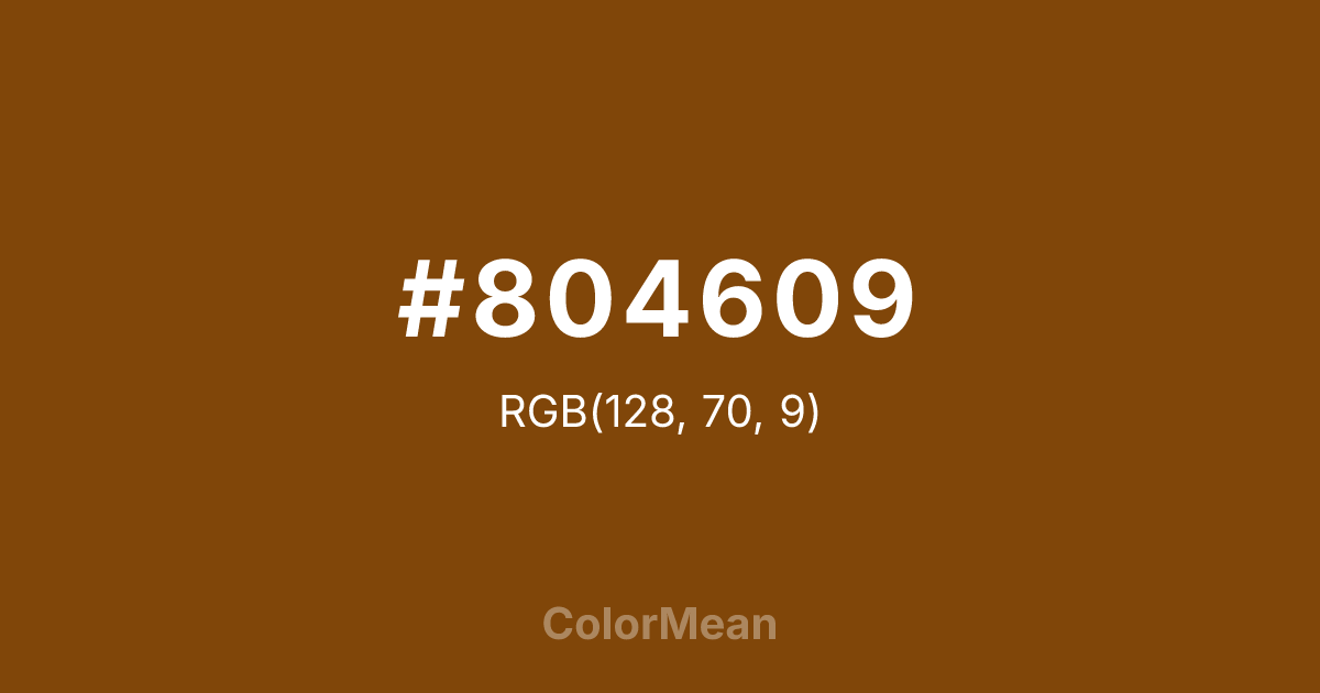 #804609 RGB value is (128, 70, 9). The hex color red value is 128, green is 70, and blue is 9. Its HSL format shows a hue of 31°, saturation of 87 percent, and lightness of 27 percent. The CMYK process values are 0 percent, 45 percent, 93 percent, 50 percent.