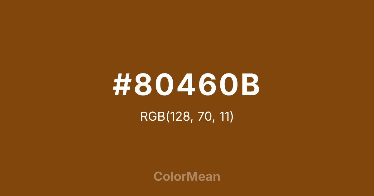 #80460B RGB value is (128, 70, 11). The hex color red value is 128, green is 70, and blue is 11. Its HSL format shows a hue of 30°, saturation of 84 percent, and lightness of 27 percent. The CMYK process values are 0 percent, 45 percent, 91 percent, 50 percent.