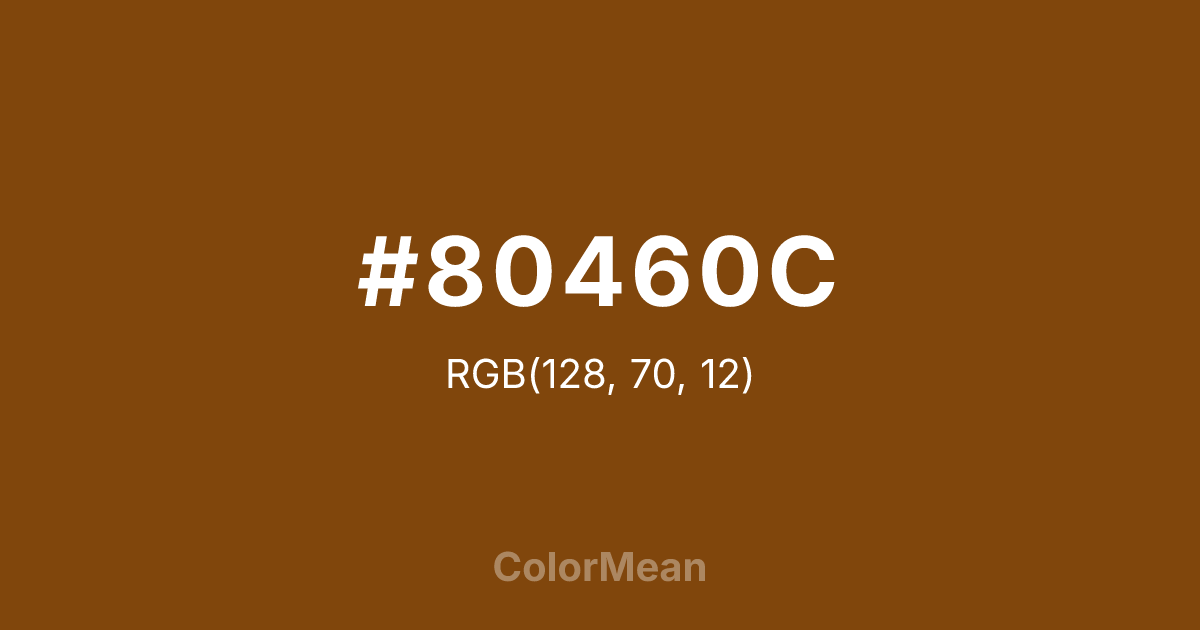 #80460C RGB value is (128, 70, 12). The hex color red value is 128, green is 70, and blue is 12. Its HSL format shows a hue of 30°, saturation of 83 percent, and lightness of 27 percent. The CMYK process values are 0 percent, 45 percent, 91 percent, 50 percent.