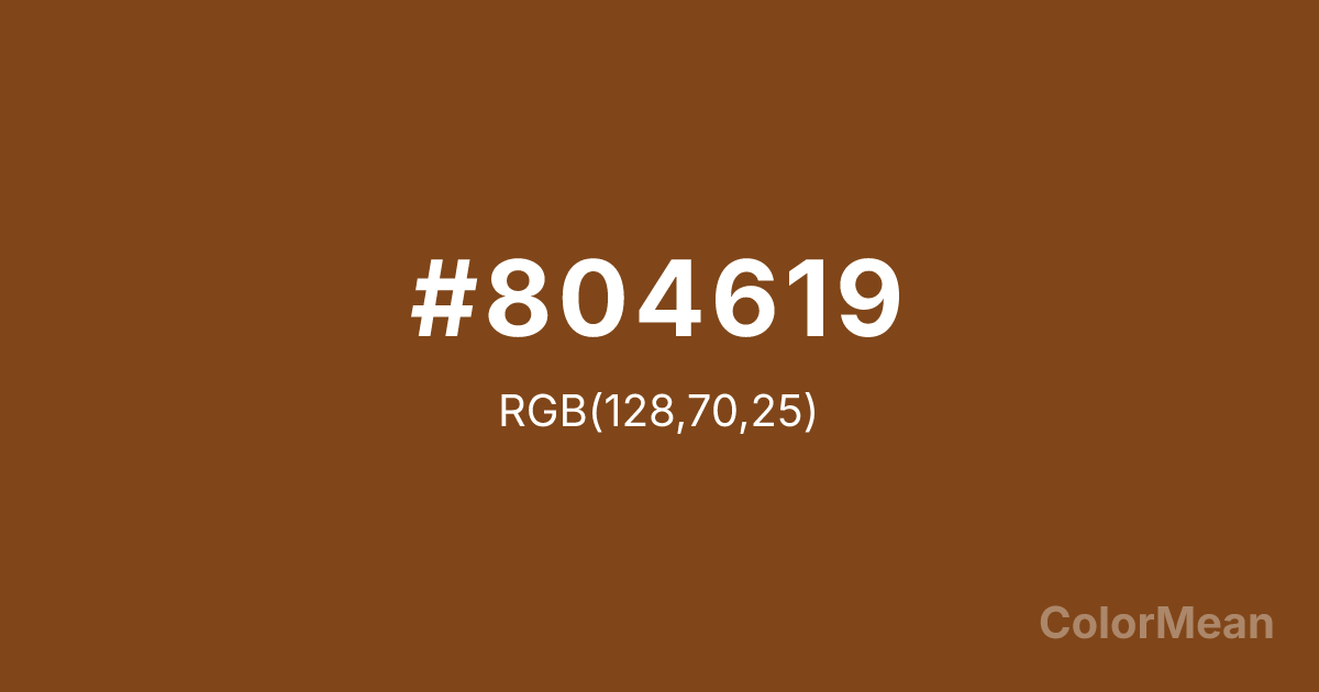 #804619 RGB value is (128, 70, 25). The hex color red value is 128, green is 70, and blue is 25. Its HSL format shows a hue of 26°, saturation of 67 percent, and lightness of 30 percent. The CMYK process values are 0 percent, 45 percent, 80 percent, 50 percent.