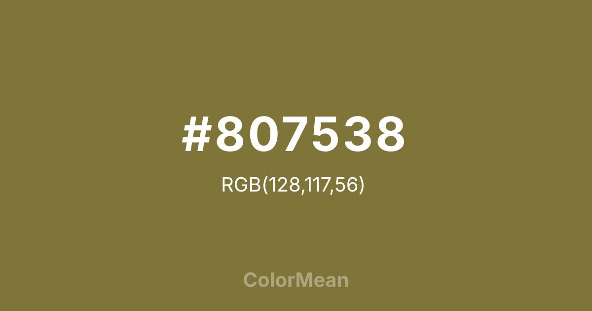 #807538 RGB value is (128, 117, 56). The hex color red value is 128, green is 117, and blue is 56. Its HSL format shows a hue of 51°, saturation of 39 percent, and lightness of 36 percent. The CMYK process values are 0 percent, 9 percent, 56 percent, 50 percent.