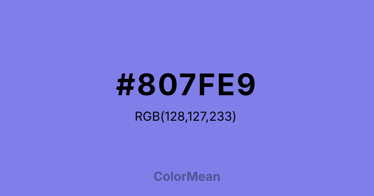 #807FE9 RGB value is (128, 127, 233). The hex color red value is 128, green is 127, and blue is 233. Its HSL format shows a hue of 241°, saturation of 71 percent, and lightness of 71 percent. The CMYK process values are 45 percent, 45 percent, 0 percent, 9 percent.