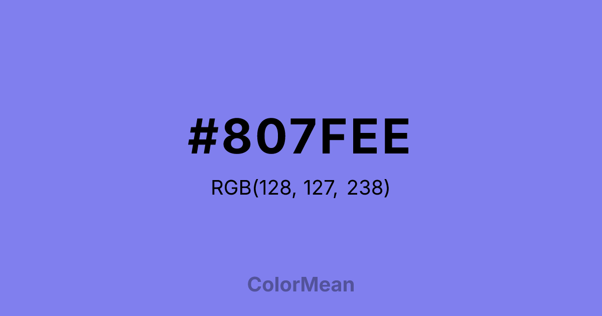 #807FEE RGB value is (128, 127, 238). The hex color red value is 128, green is 127, and blue is 238. Its HSL format shows a hue of 241°, saturation of 77 percent, and lightness of 72 percent. The CMYK process values are 46 percent, 47 percent, 0 percent, 7 percent.