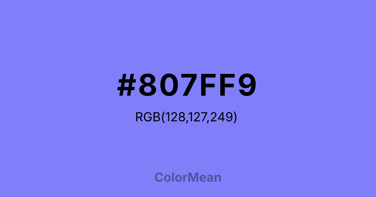 #807FF9 RGB value is (128, 127, 249). The hex color red value is 128, green is 127, and blue is 249. Its HSL format shows a hue of 240°, saturation of 91 percent, and lightness of 74 percent. The CMYK process values are 49 percent, 49 percent, 0 percent, 2 percent.