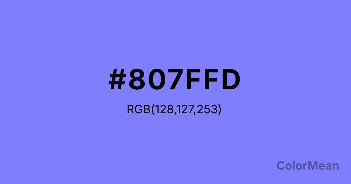 #807FFD RGB value is (128, 127, 253). The hex color red value is 128, green is 127, and blue is 253. Its HSL format shows a hue of 240°, saturation of 97 percent, and lightness of 75 percent. The CMYK process values are 49 percent, 50 percent, 0 percent, 1 percent.