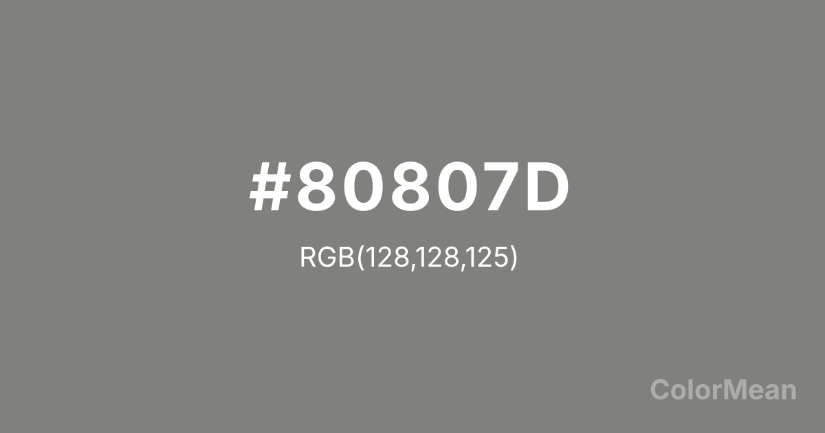 #80807D RGB value is (128, 128, 125). The hex color red value is 128, green is 128, and blue is 125. Its HSL format shows a hue of 60°, saturation of 1 percent, and lightness of 50 percent. The CMYK process values are 0 percent, 0 percent, 2 percent, 50 percent.