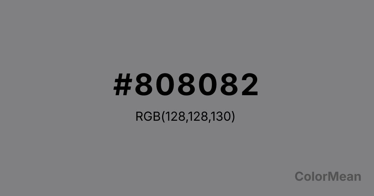 #808082 RGB value is (128, 128, 130). The hex color red value is 128, green is 128, and blue is 130. Its HSL format shows a hue of 240°, saturation of 1 percent, and lightness of 51 percent. The CMYK process values are 2 percent, 2 percent, 0 percent, 49 percent.