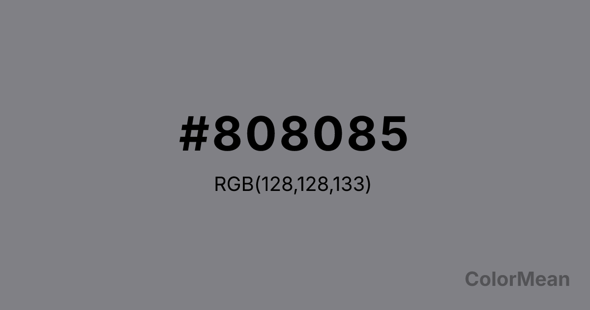 #808085 RGB value is (128, 128, 133). The hex color red value is 128, green is 128, and blue is 133. Its HSL format shows a hue of 240°, saturation of 2 percent, and lightness of 51 percent. The CMYK process values are 4 percent, 4 percent, 0 percent, 48 percent.
