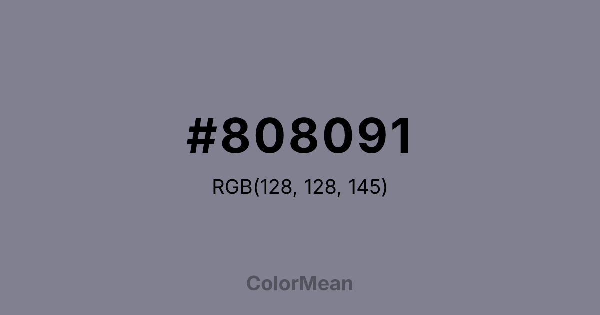 #808091 RGB value is (128, 128, 145). The hex color red value is 128, green is 128, and blue is 145. Its HSL format shows a hue of 240°, saturation of 7 percent, and lightness of 54 percent. The CMYK process values are 12 percent, 12 percent, 0 percent, 43 percent.