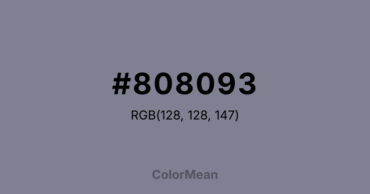 #808093 RGB value is (128, 128, 147). The hex color red value is 128, green is 128, and blue is 147. Its HSL format shows a hue of 240°, saturation of 8 percent, and lightness of 54 percent. The CMYK process values are 13 percent, 13 percent, 0 percent, 42 percent.