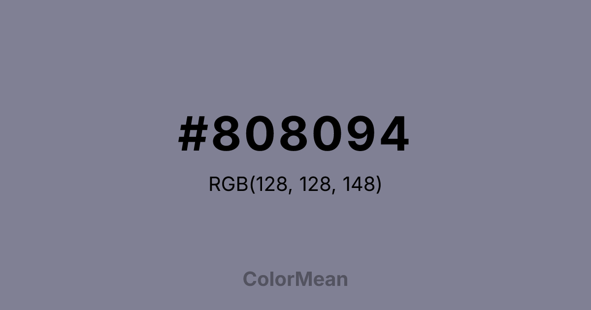 #808094 RGB value is (128, 128, 148). The hex color red value is 128, green is 128, and blue is 148. Its HSL format shows a hue of 240°, saturation of 9 percent, and lightness of 54 percent. The CMYK process values are 14 percent, 14 percent, 0 percent, 42 percent.