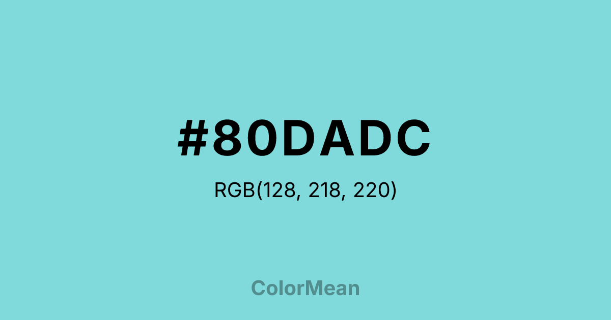 #80DADC RGB value is (128, 218, 220). The hex color red value is 128, green is 218, and blue is 220. Its HSL format shows a hue of 181°, saturation of 57 percent, and lightness of 68 percent. The CMYK process values are 42 percent, 1 percent, 0 percent, 14 percent.