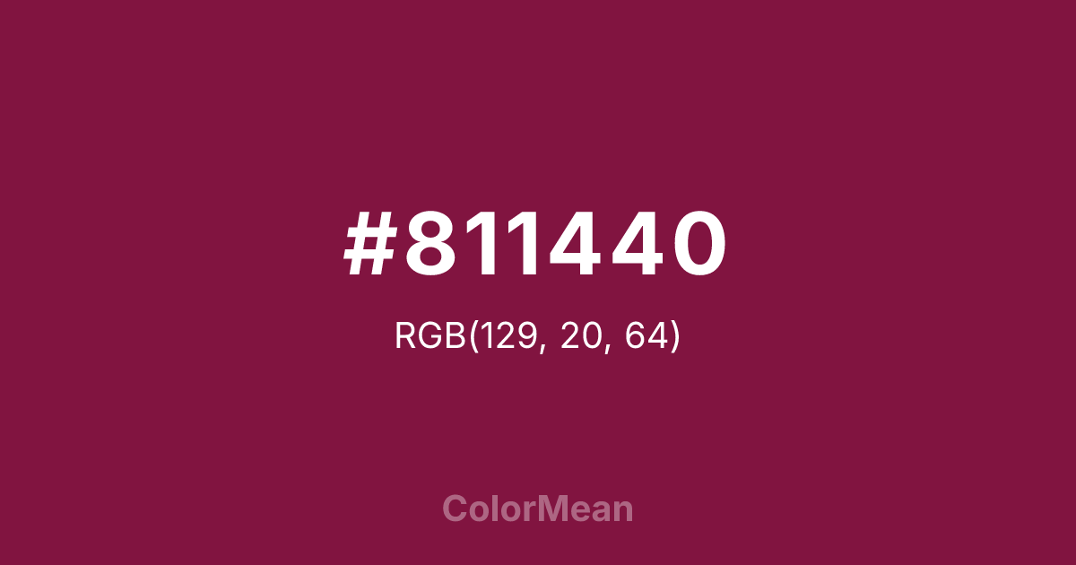 #811440 RGB value is (129, 20, 64). The hex color red value is 129, green is 20, and blue is 64. Its HSL format shows a hue of 336°, saturation of 73 percent, and lightness of 29 percent. The CMYK process values are 0 percent, 84 percent, 50 percent, 49 percent.
