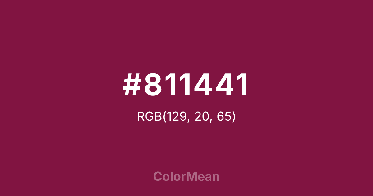 #811441 RGB value is (129, 20, 65). The hex color red value is 129, green is 20, and blue is 65. Its HSL format shows a hue of 335°, saturation of 73 percent, and lightness of 29 percent. The CMYK process values are 0 percent, 84 percent, 50 percent, 49 percent.