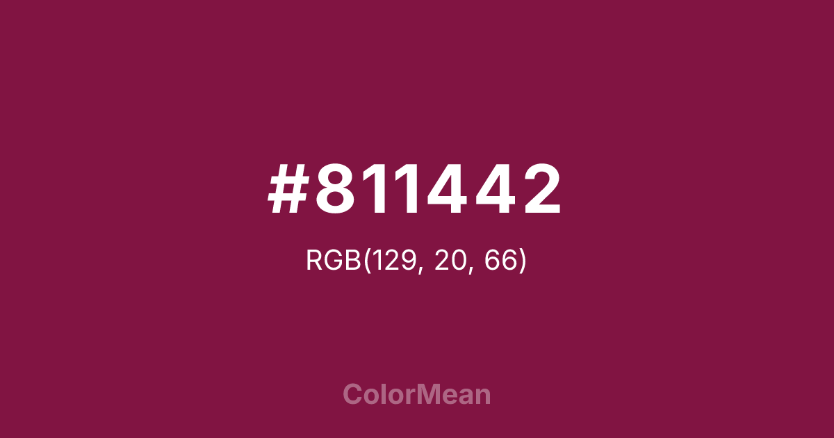 #811442 RGB value is (129, 20, 66). The hex color red value is 129, green is 20, and blue is 66. Its HSL format shows a hue of 335°, saturation of 73 percent, and lightness of 29 percent. The CMYK process values are 0 percent, 84 percent, 49 percent, 49 percent.